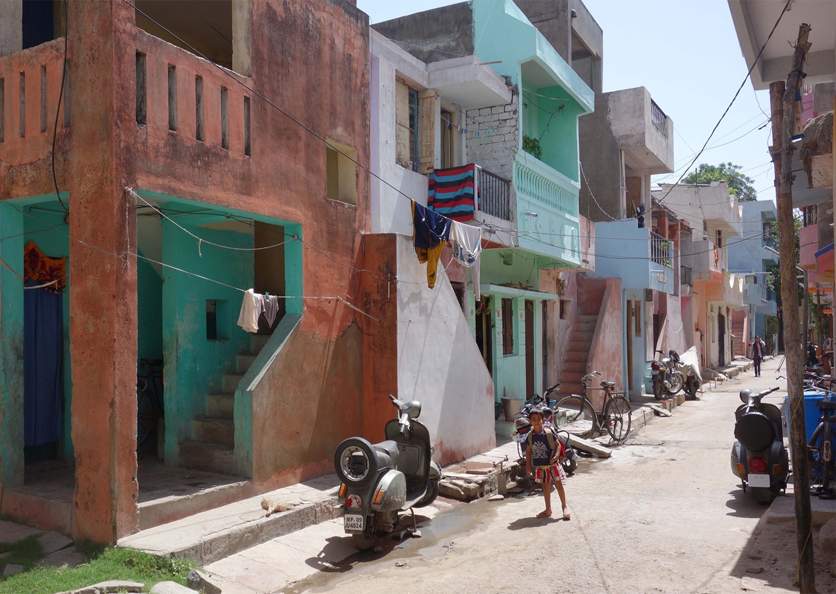 Straßenansicht der sozialen Wohnbausiedlung: »Aranya Low Cost Housing for Indore Development Authority«, Indore, 1989/