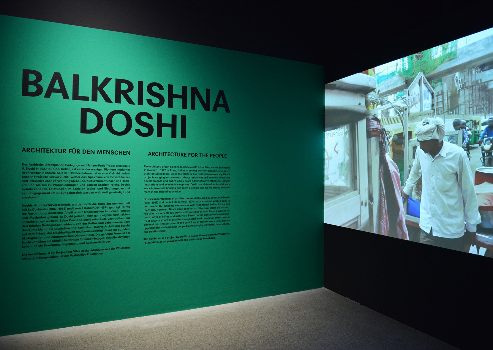 Seit den 1950er-Jahren hat Doshi mehr als 100 Gebäude realisiert, darunter Verwaltungs- und Kultureinrichtungen, Siedlungen und Wohnhäuser. International bekannt wurde er durch seine visionären Stadtplanungen und sozialen Wohnprojekte sowie durch sein großes Engagement im Bildungsbereich. Sein Verständnis von Architektur ist stark von Le Corbusier und Louis Kahn geprägt, mit denen er als junger Architekt zusammenarbeitete. Ausgehend von deren moderner Formensprache hat er jedoch ein ganz eigenes ästhetisches Vokabular entwickelt, das mit lokalen Bedürfnissen und indischen Traditionen in Einklang steht. Doshis Gesamtwerk wird in diesem Jahr erstmals in einer Retrospektive in Europa gezeigt. Anhand zahlreicher Architekturmodelle, Pläne, Malereien, Fotografien, Filme und Nachbauten seiner Architekturen in Originalgröße wird sein Schaffen in den Bereichen Architektur, Städtebau, Design und Kunst umfassend präsentiert.