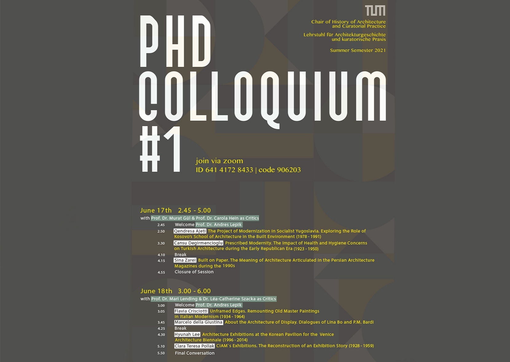 Am 17. und 18. Juni findet das erste virtuelle Doktoranden-Kolloquium der Doktorand*innen am Lehrstuhl für Architekturgeschichte und kuratorische Praxis von Prof. Dr. Andres Lepik statt.