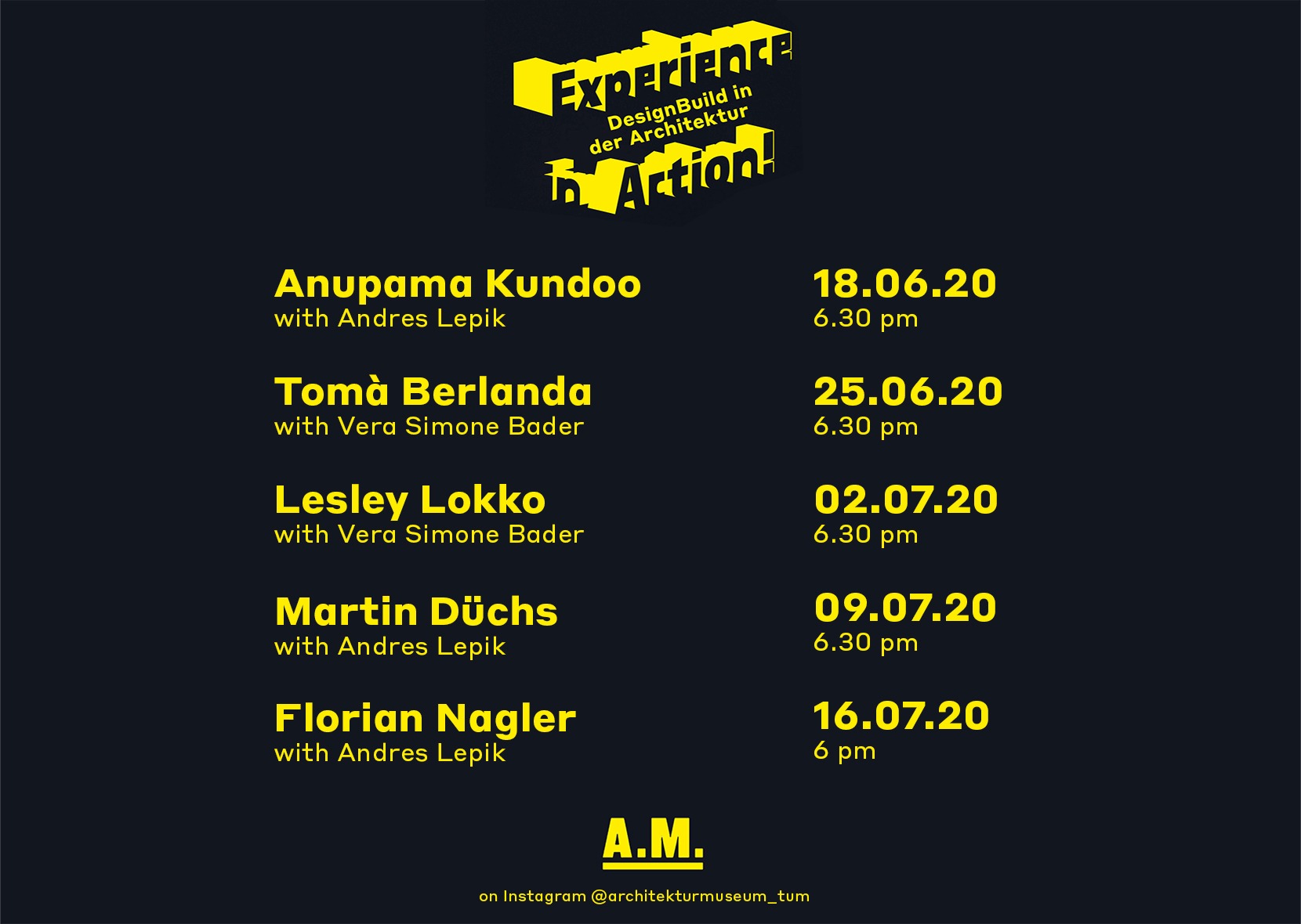 Anlässlich der Ausstellung "Experience in Action" gibt es an den kommenden vier Donnerstagen Live-Talks auf Instagram mit Architekten und Lehrenden aus Afrika, den USA, Indien und Deutschland. Wir sprechen über Themen der Evaluation und der Ethik von solchen Projekten und der Frage, inwieweit die DesignBuild-Lehrmethode zu einer Reform der Architekturausbildung beitragen kann. Die Gespräche finden vor allem auf Englisch statt.